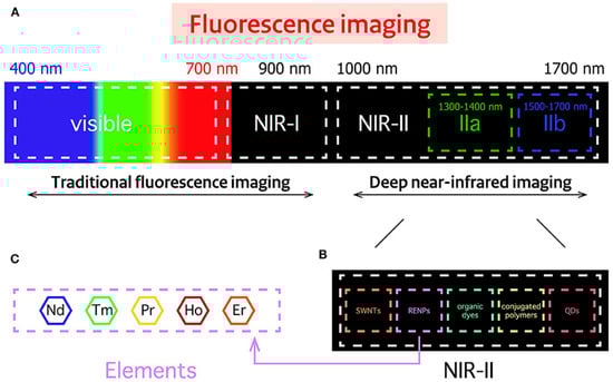 The fluorescent nanoparticles used in bioimaging can be classified into two categories: (1) fluorescent nanoparticles that can emit specific optical signals, such as carbon and metallic quantum dots, (2) fluorescent nanoparticles that require labeling with a fluorophore to be visualized, such as fluorescence mesoporous SiO2 and Fe2O3 NPs, liposomes, protein-based, and polymeric nanoparticles. Many classical fluorophores emit fluorescence at a short wavelength (e.g., the ultraviolet (UV) and visible regions) that can be easily absorbed and scattered by human tissues. This can lead to specific issues, for instance, elevated auto-fluorescence, low signal-to-background ratio, and limited tissue penetration. High-energy light could be used to overcome these drawbacks, but it can cause phototoxicity in human tissues. Optical imaging in the near-infrared (NIR) region is a possible alternative (Figure 3). Fluorophores in the first near-infrared window (NIR-I, 700–900 nm) have been tested and show good sensitivity; however, their application in bioimaging is limited due to their poor tissue penetration (less to 1 cm) and large photon scattering losses in biological matter. Therefore, fluorescent quantum dots (≤10 nm) that allow fluorescent bioimaging in the NIR-II window (1000–1700 nm) have been developed [].