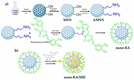 Schematic presentation showing the preparation of morin-loaded nano-antioxidants of (nano-RA/MH) loaded onto mesoporous silica nanoparticles (MSN). (a) The graphic path from the single components to therosmarinic acid nanocarrier (nano-RA) and (b) morin loading on the nanocarrier (nano-RA/MH) []. Copyright 2016, MDPI.
