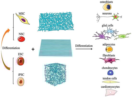 Schematic figure to show how electrospun nanofibers promote the differentiation of various types of pluripotent stem cells into different lineages []. Copyright 2020, Wiely.