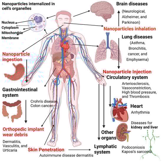 Nanomaterials are typically synthesized by one of two main approaches, i.e., bottom-up approach and top-down approach. Among all the methods, recently, the synthesis of nanomaterials by physical vapor deposition, chemical vapor deposition, electrospinning, 3D printing, biological synthesis, and supercritical fluid have gained importance, which is mingled with other methods to improve the synthesis efficiency [,]. Nanomaterials display many interesting features, such as superior mechanical performance, the possibility of surface functionalization, large surface area, and tunable porosity, compared to their bulk materials [,,]. These outstanding features explain why nanomaterials are the perfect candidates in the biomedical sector for the production of tissue-engineered scaffolds (e.g., blood vessels, bone), drug delivery systems (gene therapy, cancer treatments, drugs for chronic respiratory infections), chemical sensors [,], biosensors [,], and wound dressings [,]. Remarkably, several studies suggest that ancient civilizations in India, Egypt, and China used nanotechnology (metallic gold) for therapeutic purposes in 2500 BC []. Nanomaterials’ discrete features can complicate the assessment of the effects and the toxicity risk associated with their use in a biological environment. Indeed, nanomaterials’ chemical composition, size, shape, surface charge, area, and entry route in the body can influence their biological activities and effects [].