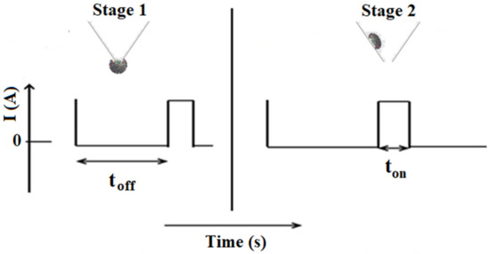 The principle behind the functioning of the stochastic sensor is based on pore conductivity [19,20,21,22]. The current development of stochastic sensors is shown in Figure 2. Accordingly, with the principles of stochastic methods, all molecules from a solution (sample) may enter into the pores/channels as a function of their sizes, geometry, stereochemistry, and capacity for unfolding. The molecule responsible for the stochastic sensing was the PIX, which in contact with water forms at the membrane–solution interface molecular aggregates presenting the necessary pores for stochastic sensing. After the application of 125mV (Figure 2), the molecular recognition of the biomarkers takes place in two stages. During the first stage, the analyte enters the pore and blocks it, and the current intensity drops to 0 A until the whole analyte enters the pore—the time needed to enter the pore is the signature of the analyte (toff value) and is the qualitative parameter. In the second stage, the interaction of the analyte with the wall of the pore and the redox processes take place during the ton—its value is measured in between two toff values and is the quantitative parameter.