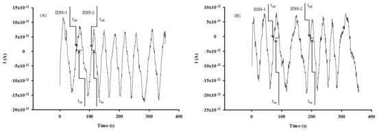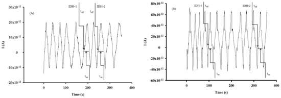 Eight brain tumoral tissues and twelve whole blood samples were screened using the proposed stochastic microsensors. Typical diagrams obtained for the screening tests of the brain tumoral tissue and whole blood samples (Figure 4 and Figure 5) were used to perform the molecular recognition of IDH1 and IDH2, based on their signatures, as well as the quantification of IDH1 and IDH2 using the equations of calibration (Table 1). No processing of samples was needed in the case of tissue or whole blood samples; the cell was filled with the sample, and the three electrodes were inserted in the sample. After recording the diagram, the IDH1 and IDH2 were identified accordingly with their signatures (toff), and after that, the ton values were read (in between two toff values) and used in the calibration graphs accordingly with the stochastic mode described above, for the quantification of IDH1 and IDH2.