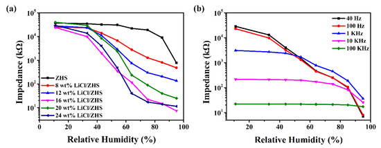 Figure 4b exhibits the relationship between the impedance of 16 wt% LiCl/ZHS and RH at various frequencies (40 Hz, 100 Hz, 1 kHz, 10 kHz, 100 kHz). The operating frequency significantly influenced the humidity sensitivity performance. When the operating frequency is low, the impedance of the sensor produces a dramatic decrease. As the frequency increases further, the impedance tends to be flat with the RH variation. This result is due to the fact that the polarization process of water is lower than the change of electric field at high frequency [43]. Overall, the measurement at low frequency is unstable, and the sensitivity of the humidity sensor is low at high frequency. So, we chose 100 Hz as the best working frequency. When the operating frequency is set as 100 Hz, the impedance of the 16 wt% LiCl/ZHS humidity sensor drops from 23,000 to 8 kΩ as the humidity changes from 11% to 95% RH, contributing to a high sensitivity of about four orders of magnitude. Compared to the humidity sensor performance reported in previous work (Table 1), the LiCl/ZHS sensor had a high response and fast response/recovery speed.