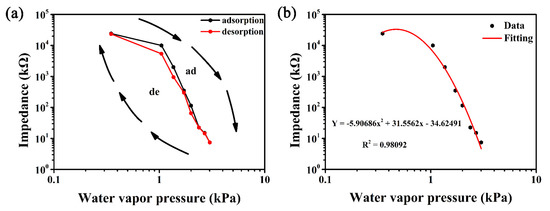 Figure 5a demonstrates the humidity hysteresis characteristics of 16 wt% LiCl/ZHS based sensor within 11–95% RH, under the condition of 1 V AC voltage and 100 Hz. When our sensor devices test for different humidity levels, we do so manually by quickly switching between humidity environments, which may be affected by ambient air along the way. The adsorption and desorption of water molecules were highly reversible, and no obvious hysteresis was observed. In the range of 11–95% RH, the maximum wet hysteresis difference of the sensor is less than 9.5% RH. The fitting function of impedance Y and the water vapor pressure X of 16 wt% LiCl/ZHS humidity sensor is Y = −5.90686X2 + 31.5562X − 34.6291, and the regression coefficient R2 = 0.98092. Generally speaking, the lower the water vapor pressure, the higher the impedance of the sensing material. However, the maximum impedance can be seen on the fitted image at a water vapor pressure of 0.4 kPa, which may be caused by the statistical error of low relative humidity measurement not considered in the numerical fitting.