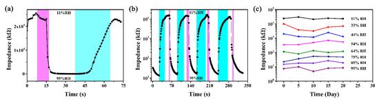Response time refers to the time required for the sensor to reach 90% of the total impedance change during the moisture absorption and desorption. Figure 6 shows the response and recovery characteristics of the 16 wt% LiCl/ZHS-based humidity sensor after a single period and four periods. It is obvious from Figure 6a that the response time is less than 10 s, and the recovery time is shorter than 32 s. The four periods’ response and recovery characteristics exhibit the high stability and repeatability of the sensors reported herein. The average response and recovery time after four testing cycles were 11.35 s and 30.6 s, respectively. Stability is an important characteristic of sensors. The impedance changes of 16 wt% LiCl/ZHS humidity sensor from 11% to 95% RH were measured in 20 days. It can be observed that the impedance only fluctuates slightly under different RH, so this sensor can be used as a humidity measurement device.