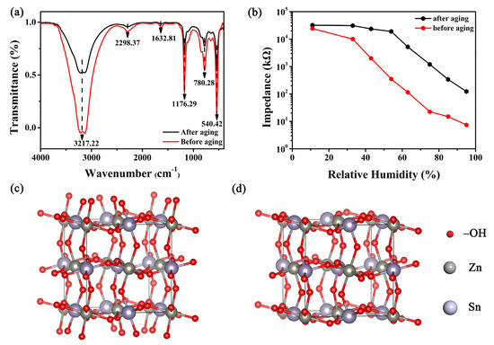 It is worth mentioning that the absorption peak at 3217 cm−1 shows distinct changes before and after aging. Compared with the decreased number of hydroxyl groups after aging, a large number of hydroxyl groups that exist before aging enable the samples to possess a strong adsorption capacity for water molecules. Such changes in the number of hydroxyls were also proved by analyzing the ZHS crystal structure and humidity characteristics before and after aging of the sensors, as shown in Figure 7b–d. The surface structure of ZHS was covered with hydroxyl functional groups before aging, the number of which dropped sharply after the aging process. It appears that the hydroxyl groups have been destroyed during the aging process. Consequently, the adsorption capacity of water molecules for the 16 wt% LiCl/ZHS sample was significantly reduced. The above analysis matches well with the humidity sensitivity characteristic curves exhibited in Figure 6b. Before aging, the 16 wt% LiCl sensors had high sensitivity and good linearity. The sensitivity of this sensor after aging reduces evidently, and the linearity becomes poor. This result is in good agreement with the outcome of FTIR analysis. Hence, it was inferred that the number of hydroxyl functional groups is crucial to the detection of humidity and performance of the humidity sensor. However, the absorption peak around 2298 cm−1 [47] is a result of the asymmetric stretching vibration of atmospheric CO2 or CO2 adsorbed on the ZHS sample. The absorption peak at 1632 cm−1 [48] is related to the in-plane vibration of the H-O-H bending band of the adsorbed water molecule or the C=C of the sp2 hybrid.