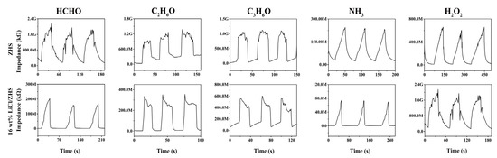 To ensure the anti-interference of the ZHS and 16 wt% LiCl/ZHS humidity sensor in the presence of some other gas molecules in the air, we selected HCHO, C2H6O, C3H6O, H2O2, and NH3 at a concentration of 500 ppm to conduct the cross-sensitivity test, as shown in Figure 8. The response of the ZHS sensor to a concentration of 500 ppm of HCHO, C2H6O, C3H6O, and NH3 can be observed to be very small. Among all the gases, the sensor exhibits the highest response toward NH3. At the same time, the sensor has good repeatability and stability after different testing cycles. After introducing LiCl, the response of the 16 wt% LiCl/ZHS sensor to these gases improved dramatically, which is attributed to the active site induced by doping nanoparticles on the ZHS surface. Moreover, the response of the 16 wt% LiCl/ZHS-based sensor to NH3 (2.0 × 106 Ω) is equivalent to that at 43% RH. Hence, the 16 wt% LiCl/ZHS humidity sensor before aging was immune to these gases in the 64–95% RH range. With regard to the highest response of ammonia, according to the widely accepted gas sensing theory, the sensitivity of the resistance gas sensor is related to the change of electron depletion layer. When the 16 wt% LiCl/ZHS sensor is exposed to the target gas, the surface will absorb oxygen (O2−, <100 °C; O−, 100–300 °C; O2−, >300 °C) with the following reaction equations: