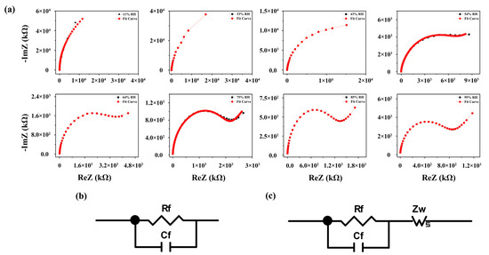 (a) The complex impedance spectroscopy (CIS) plots of 16 wt% LiCl/ZHS sensor at various RHs (b,c) and their corresponding equivalent circuits.
