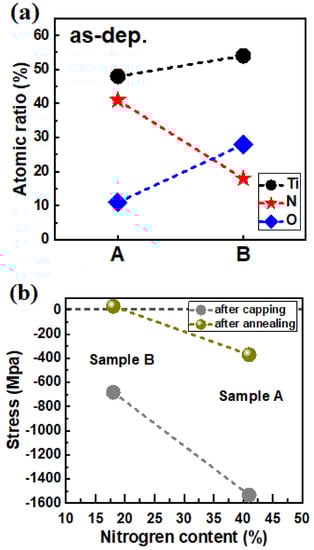 (a) Atomic ratio of the TiN electrodes in Sample A and Sample B and (b) stress as a function of the nitrogen content.