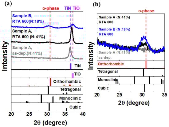 Figure 3 shows the grazing incidence X-ray diffraction (GIXRD) analysis of Sample A, Sample B, and an as-deposited (as-dep) sample. A positive peak shift of TiN is observed by comparing the as-dep sample and Sample A, indicating that the decreased distance of the (111) plane is due to an extra compressive stress in the (111) direction after thermal annealing. Moreover, Sample B with 18% N in TiN shows an apparent TiOx peak at ~37.2°, specifying the formation of titanium oxide compounds. The higher oxygen content in the TiN (Sample B) could retard the oxygen inter-diffusion, alleviating the formation of oxygen vacancies in the HZO []. The coefficient of thermal expansion (CTE) of TiOx, i.e., 9.9 × 10−6/K, is considerably higher than that of TiN []. Therefore, the TiN with 18% N has a high compressive stress. The crystallization property of the HZO film is displayed in Figure 3b. Sample B exhibited strong GIXRD intensity in the mixed orthorhombic/tetragonal/cubic phases.
