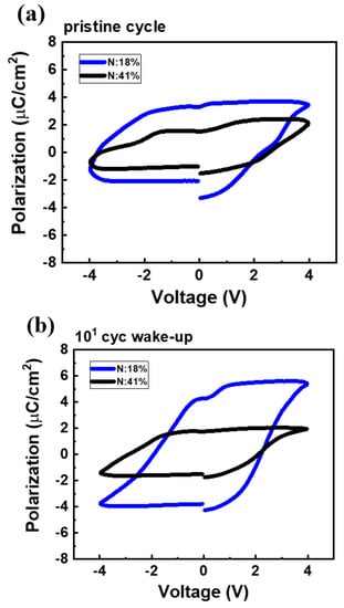 For further understanding the effect of strained TiN on ferroelectricity, a positive-up- negative-down (PUND) pulsing scheme with time steps of 5 µs was used for polarization extraction. The P–V characteristics in a pristine cycle and after 10 cycles are shown in Figure 4. The TiN sample with 18% N exhibited higher 2Pr values in the pristine cycle (5.4 µC/cm2) and after 10 cycles (8 µC/cm2, which is 2.5 times the corresponding value for the sample with 41% N) than the TiN sample with 41% N.