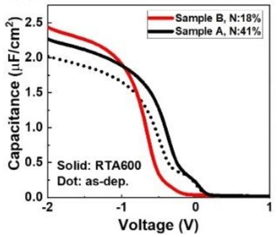 Moreover, the device with compressive strain in TiN exhibits a higher capacitance value in the accumulation region (Figure 5) than the as-dep device. This result is mainly attributed to the higher k value resulting from the orthorhombic phase than from the other phases. Furthermore, Sample B exhibits a higher capacitance than Sample A.