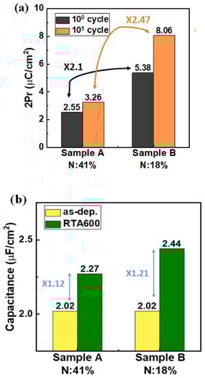 Figure 6 summarizes the 2Pr and capacitance values in the accumulation region in Samples A and B. An obvious increase in 2Pr and capacitance value is observed in Sample B rather than in Sample A, indicating that the tensile stress induced in the HZO film by compressive TiN with 18% N can enhance ferroelectricity.