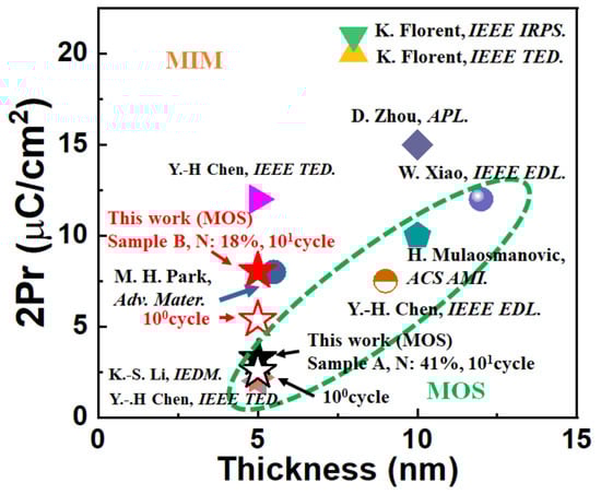 Benchmark of 2Pr for HfO2-based ferroelectric capacitors with different structures and film thicknesses [,,,,,,,,].