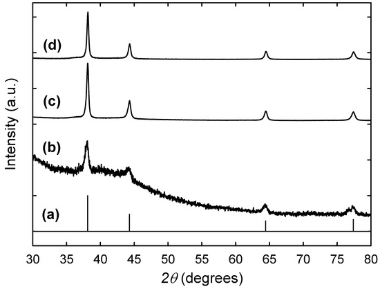 X-ray diffraction patterns of the Ag NPs embedded in resin beads prepared with increasing AgNO3 concentrations of 1 mM (b), 10 mM (c), and 50 mM (d) and compared with that of bulk fcc silver in the JCPDS database (a).