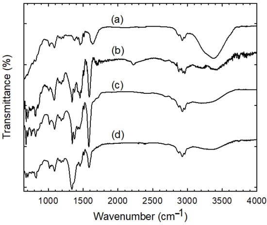 A comparison of FTIR spectra of the pure resin in chloride form (a) and those loaded with silver particles using increasing AgNO3 concentrations of 1 mM (b), 10 mM (c), and 50 mM (d).