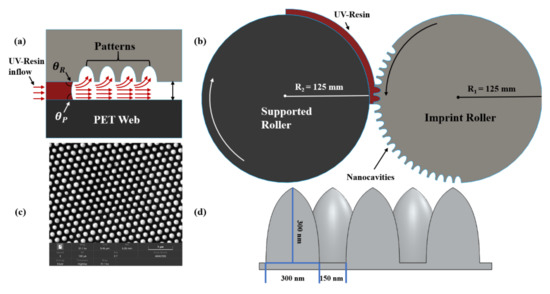 - Ye, H.; Shen, L.-G.; Tao, B.; Li, M.-J. A study of the bubbles in UV micro roll-to-roll imprinting. Int. Polym. Process. 2014, 29, 602–606. [Google Scholar] [CrossRef]
