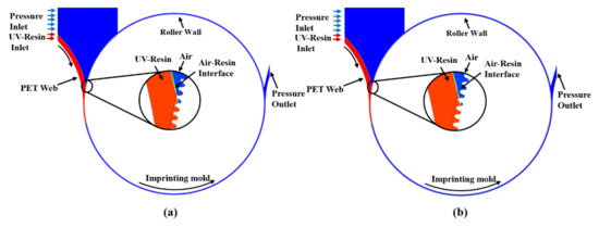 The RTR-UV imprinting technique involves the rotation of the imprint mold, as well as the translational movement of the polyethylene terephthalate (PET) substrate, can be calculated by . Here, and represents the translational and rotation speed of PET-Web and imprinting mold. is the radius of imprint mold and supporting roller. A thoroughly constructed model that includes the entire physics of the problem is required to examine the filling process and optimization of the imprinting speed (IS). The majority of the above studies utilized different numerical models but their models have several limitations, such as the flow of UV resin between two parallel plates and the modeling of a tiny part of the imprinting process without taking air into account, as illustrated in Figure 1a.