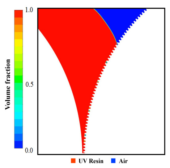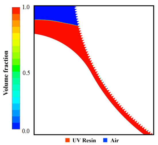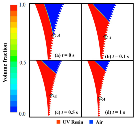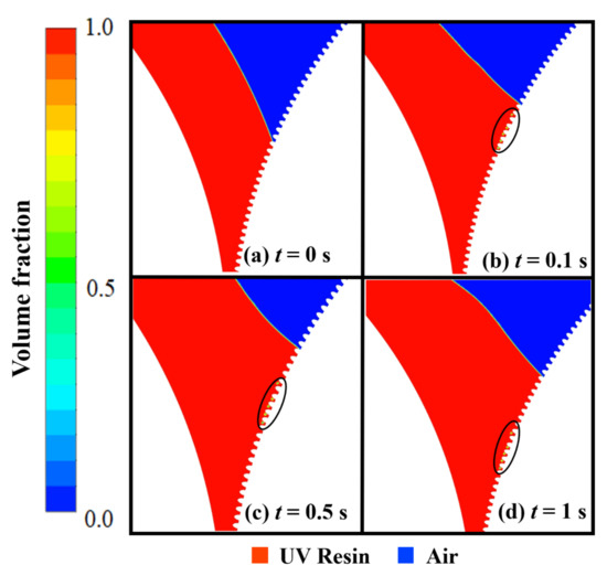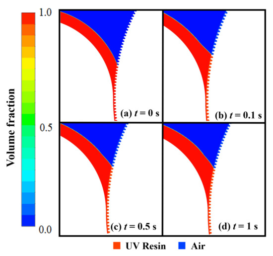 In this scenario, the UV resin fills vertically into the nanocavities and leaves the bubble entrapment alone if we reduce the initial thickness of UV resin above the PET substrate. If the supporting roll diameter is half of the diameter of the imprinting mold diameter, then UV resin easily goes into the nanocavities during the imprinting process as shown in Figure 10b. Figure 11a–d shows the complete filling of UV resin into the nanocavities at different time steps. Reducing the diameter of supporting roll shows that the UV resin fills the nanocavities with a minimum initial thickness of 1.5 μm on the PET substrate.