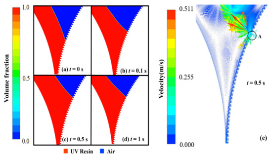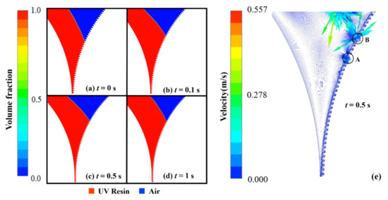 To get the successful filling at both ends of the imprinting mold without bubble entrapment, we decrease the viscosity of the UV resin up to 180 cp by keeping other parameters the same as in the previous simulation (see Supplementary Materials Video S1f). Figure 9e shows the velocity vectors distribution of UV resin filling and rotation of the imprinting mold at t = 0.5 s. Due to surface tension of UV resin and adhesive force from the imprinting mold, the velocity vectors distribution significantly increases in cavity A and replaces the air with UV resin.