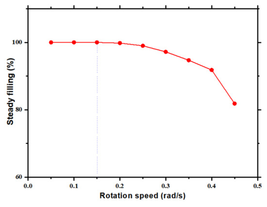 The UV resin successfully fills the cavities at the preceding end of the imprint mold, but a small amount of air is still let into cavity A. This problem arises due to the viscosity of UV resin. To resolve this problem, we decrease the viscosity of UV resin to 180 cp during the filling process. Figure 4b–d represents the UV resin filling at different time steps. Nanopillars are successfully filled with UV resin (see Supplementary Materials Video S1c). The UV resin successfully fills the nanopillars at the prior and succeeding ends of the imprint mold during simulations. The processing parameters such as initial thickness, CAs, and PET-Web speed were kept the same as in previous simulation. For the filling process, and are the appropriate CAs measured after running several simulations. In numerical simulations, the CA values vary depending on the pattern shape. As a result, we kept them in a feasible range for successful filling of nanocavities. Figure 4e shows the contours for the velocity vector distribution of UV resin filling and rotational motion of imprinting mold at t = 0.5 s.