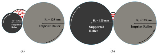 In this study, we also investigated the effect of supporting roll diameter during the filling process because it has a direct impact on the initial contact of UV resin with the imprinting mold. The imprint mold and supporting roller of the same diameter are shown in Figure 10a.