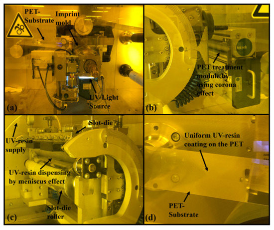 (a) Imprinting unit of roll-to-roll (RTR) system with PET-Web of width 250 mm, capable of imprinting the patterns with a speed up to 10 m/min. (b) PET substrate treatment unit that incorporates with corona effect to increase adhesion of UV resin with PET substrate. (c) Slot-die unit with a dispensing source and dispensing of UV resin on PET substrate by using meniscus effect. (d) Uniform coating of height 5 μm of UV resin on PET substrate.