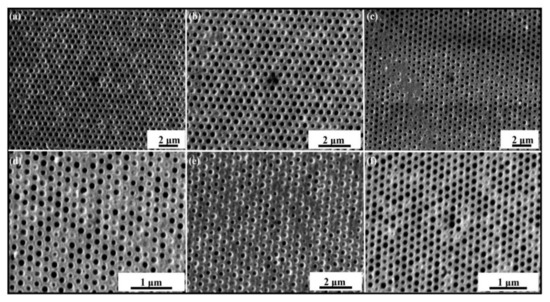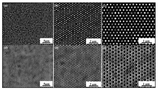The experiments were performed by utilizing the optimized parameters through the numerical simulations such as viscosity, IS, gap between two consecutive nanocavities, and initial thickness of UV resin above the PET substrate. Figure 13a shows the hexagonal arrangement of elliptical nanopillars. Figure 13b,c represents the top and enlarged view of fabricated nanopatterns by using soft mold through the RTR imprinting process. The diameter, depth, and width of these patterns were 300 nm. Figure 13d shows the SEM images of hexagonal elliptical nanopores of depth 300 nm. Figure 13e,f shows the enlarged view of elliptical nanopores. These SEM images represent the successful imprinting of nanopatterns by using RTR imprinting.