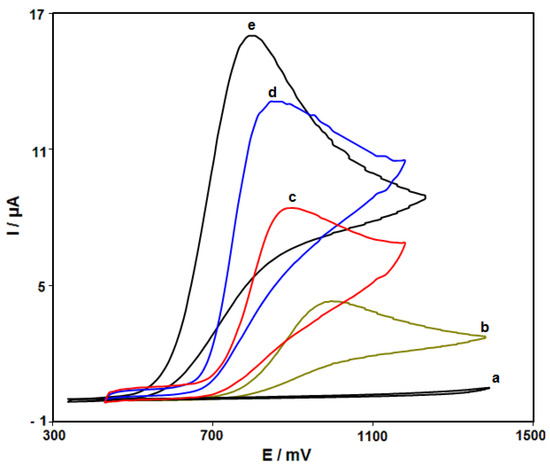 Cyclic voltammograms (CVs) recorded for electrooxidation of hydrazine. Curve a is the CV of bare SPE in 0.1 M PBS at the pH value of 7.0. Curves b–e are CVs at the surfaces of bare SPE, ZnFe2O4/SPE, RGO/SPE and ZnFe2O4/RGO/SPE in the presence of 0.1 M PBS at the pH value of 7.0 for the detection of hydrazine (250.0 μM). In all cases, the scan rate is 50 mV/s.
