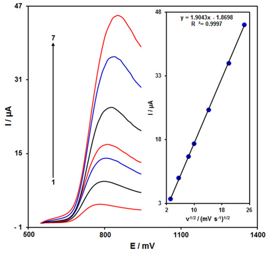 Figure 3 shows the scan rate impact on the hydrazine oxidation current, the results of which indicated an increase in the peak current with increasing scan rate. The oxidation process followed the diffusion-limited reactions obtained from the linear dependence of the anodic peak current (Ip) on the square root of the scan rate (ν1/2, 10–600 mV/s).