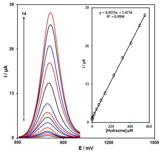 DPVs of ZnFe2O4/RGO/SPE in the presence of 0.1 M PBS at the pH value of 7.0 for detection of hydrazine at different concentrations, indicated by numbers 1–14 corresponding to 0.03, 0.3, 3.0, 10.0, 25.0, 50.0, 75.0, 100.0, 150.0, 250.0, 350.0, 450.0, 550.0, and 610.0 µM of hydrazine. Inset: plot of peak current as a function of different hydrazine concentrations (0.03–610.0 µM).