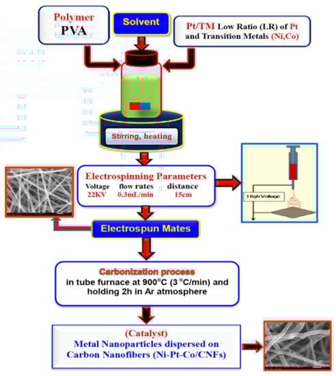 Figure 1 shows a schematic illustration of the synthetic procedure of metal embedded in carbon nanofibers (MNPs/CNFS). Solutions of PVA (Alpha, Germany) 10 wt% concentration in water containing Nickel (II) acetate tetrahydrate (NiAc, 98% (Alpha, Germany)), Cobalt acetate (CoAc, 98% (Alpha, Germany)), and H2PtCl6 (Alpha, Germany). The theoretical metal loading and carbon ratio were fixed at 20 and 80 wt%, respectively. The theoretical Ni:Co:Pt molar ratio is 55:30:15, 70:15:15 and 85:15 for Ni4Co2Pt/CNFs, Ni5CoPt/CNFs and Ni6Pt/CNFs, respectively. Typically, 1.2896:1.9930 gm NiAc (Ni11:17wt%), 0.25–0.5 gm CoAc (Co3–6wt%) and 0.1755 gm H2PtCl6 (Pt3wt%) were mixed with PVA solution to make a combination of 80 weight percent polymer and 20 weight percent (Ni/Co/Pt) of various mass ratios. For all samples, total metal loading was kept at 20%, with varying percentages of particular metals as shown in Table 1. The mixture was stirred at room temperature (RT) overnight until it obtained a clear and homogeneous solution. Homogeneous electrospinning solutions were loaded in 20 mL. Positive voltage, working distance, and flow rate were the optimal Electrospinning parameters, which were 22 kV, 15 cm and 0.3 mL/h, respectively. On the surface of a metal plate, nanofibers were accumulated as a fibrous web. The electrospun PVA/Ni(Ac)-Co(Ac)-H2PtCl6 nanofibers were dried in a vacuum at 80 °C for 24 h before being carbonized in an argon environment at 900 °C for 7 h (heating rate 3 °C/min, holding 2 h).