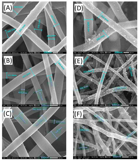 The electrospinning process was used to successfully produce PVA/NiAc-CoAc-Ptcl nanofibers. Figure 2A–C shows SEM images for the PVA nanofibers mats loaded with the salts of the metals (NiAc-CoAc-PtCl) before carbonization. All of the SEM images of the nanofibers obtained indicate clearly smooth, bead-free nanofibers. The average fiber diameter ranges from 200 to 580 nm. No significant difference was observed between the fiber morphologies of the prepared nanofibers. After the carbonization process, the polymer is transformed into carbon nanofibers [], with metallic nanoparticles being distributed over them. Figure 2D–F shows SEM images of carbon nanofibers loaded with Ni4Co2Pt, Ni5CoPt, and Ni6Pt nanoparticles after carbonization at 900 °C in an argon atmosphere. These images demonstrate that the used approach for making decorated carbon nanofibers with metallic nanoparticles can be employed successfully. Except for reducing the fiber diameter to the range of 150–200 nm, the carbonization procedure had no significant influence on the nanofibrous shape of the electrospun nanofibers, as shown in the figure.