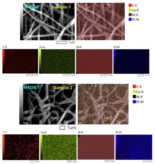 Figure 4 demonstrates the SEM image and corresponding EDX mapping analysis of the Ni4Co2Pt/CNFs (sample 1) and Ni5CoPt/CNFs (sample 2), respectively. (IMG1) represents the area that was scanned to know the components of the fibers. From Figure 4, for sample 1 and sample 2, it can be seen that the distribution of C element as nanofibers was homogeneous and dense on the whole samples. Also, the nanoparticles of Ni, Pt and Co are distributed fully and uniformly on the surface of carbon nanofibers, as presented in the figure. Furthermore, the elemental mapping images (Figure 4) confirmed the shiny NPs as Ni, Pt and Co no other foreign impurities were detected, and this was also proven by the X-ray results. According to this study, transition metals (nickel, cobalt and platinum) were successfully integrated into carbonized PVANFs. This is owing to the transition metal’s ability to bind to PVA’s hydroxyl groups and then the carbon content after carbonization []. The proposed preparation process is considered a good procedure for the synthesis of the carbon nanofibers decorated by metal nanoparticles after carbonization.