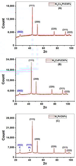 X-ray diffraction patterns of (A) Ni4Co2Pt/CNFs, (B) Ni5CoPt/CNFs, and (C) Ni6Pt/CNFs.