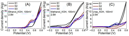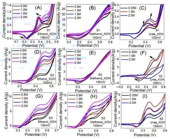 For Sample S2, Figure 8D–F, the highest current density was observed using 2 M ethanol. The value of the highest current density is 21.9 A/g @ 2 M ethanol, 15.3 A/g @ 2 M methanol and 9.7 A/g @ 0.33 M urea. For ethanol, the current density of the oxidation peak is increased from 1.1 A/g @ 449 mV to 8.2 A/g @ 515 mV with onset potential increased from 310 to 329 mV as the concentration increased from 0.5 M to 2.0 M. For methanol, the current density of the oxidation peak is decreased from 1.5 A/g @ 356 mV to 1.1 A/g @ 359 mV as the concentration increased from 0.5 M to 2.0 M with onsets increased from 280 to 298 mV. For urea, the oxidation peak current density is increased from 1.8 A/g @ 560 mV to 6.0 A/g @ 545 mV with increasing the concentration from 0.33 M to 1.0 M and then decreased to 2.5 A/g @ 688 mV as the concentration raised to 2.0 M. Similarly, the inset potential reduced from 357 to 353 mV and then increased to 522 mV. Therefore, this sample is more efficient for electrooxidation of 2.0 M ethanol and 1.0 M urea than 2.0 M methanol. Whereas the energy required for the electrooxidation of urea is less than ethanol.