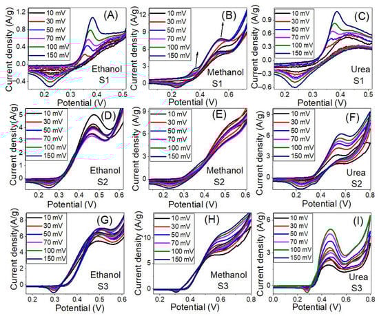 The influence of the scan rate on the electrocatalytic activity of samples S1 (A–C), S2 (D–F) and S3 (G–I) for electrooxidation of ethanol, Methanol, and Urea in 1.0 M KOH solution at RT.