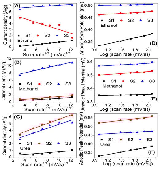 Current density versus the square root of the scan rate(A–C) and anodic peak potential versus the logarithm of the scan rate (D–F) for the electrooxidation of ethanol, methanol, and urea utilizing samples S1, S2 and S3.