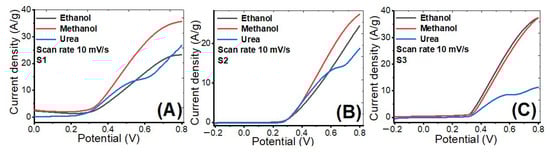 Linear sweep voltammetry plots at scan rate 10 mV/s of prepared (A) S1, (B) S2 and (C) S3 in ethanol, methanol, and urea at the optimized concentrations.