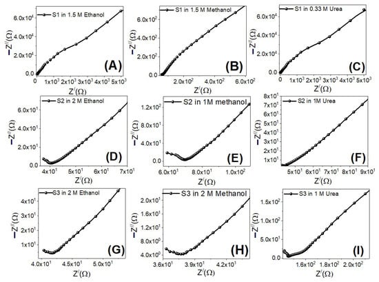 Nyquist plots for electrodes S1 (A–C), S2 (D–F) and S3 (G–I) in ethanol, methanol, and urea at the optimized concentrations and 0 V (vs. Ag/AgCl).