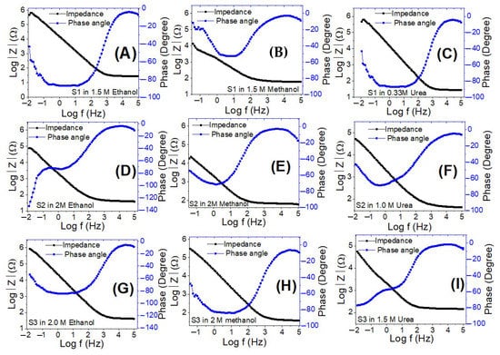 Bode plots for electrodes S1 (A–C), S2 (D–F), and S3 (G–I) in ethanol, methanol, and urea at the optimized concentrations and 0 V (vs. Ag/AgCl).