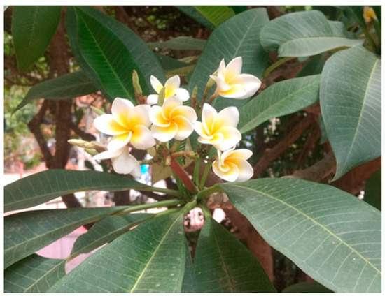 18. Gupta, M.; Rakhi; NishaYadav; Saroj; Pinky; Siksha; Manisha; Priyanka; Amit; Rahul; et al. Phytochemical screening of leaves of Plumeria alba and Plumeria acuminata. J. Chem. Pharm. Res. 2016, 8, 354–358. [Google Scholar]