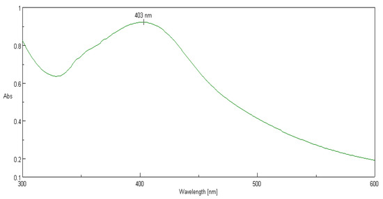 The present study was aimed at synthesizing AgNPs from a P. alba leaf aqueous extract; the synthesis was confirmed by a change in the color of extract from pale yellow to reddish-brown suspension after mixing with 1 mM AgNO3 (1:5 v/v) and incubation for 24 h (Figure 2). Furthermore, the UV–visible spectroscopic analysis confirmed the production of AgNPs after the incubation period of 24 h in the dark chamber with an absorption peak observed at a wavelength of 403 nm (Figure 3), which is the characteristic feature of surface plasmon resonance (SPR), as it confirmed the synthesis of AgNPs.