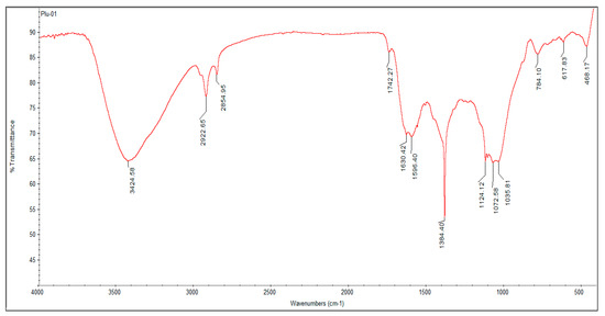 The transmittance FTIR analysis of synthesized nanoparticles was carried out to determine the probable functional groups involved in the capping and proficient stabilization of nanoparticles. The P-AgNPs were dried in a thermostatted desiccator at 45 °C for 24 h to avoid the presence of water molecules and thoroughly ground with potassium bromide (about 5% of P-AgNPs) and pressed to make thin discs. The spectrum of AgNPs from P. alba leaf extract was recorded in the transmittance mode between 400 cm−1 and 4000 cm−1 at a resolution of 4 cm−1 using NICOLET 6700 FTIR Spectrophotometer (Waltham, MA, USA).