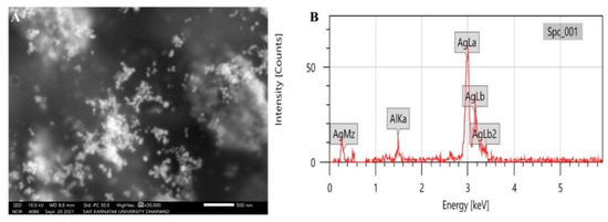 Shape, morphology, and nature of distribution of synthesized AgNPs were analyzed by scanning electron microscope (SEM), and silver presence was confirmed by energy dispersive spectroscopy (EDX). The sample for SEM analysis was prepared by placing a very small quantity of AgNPs on sticky conductive carbon tape mounted on aluminum stub followed by gold sputtering for 3 min. The imaging and elemental analysis was carried out through scanning electron microscope (JSM-IT 500LA, Tokyo, Japan).