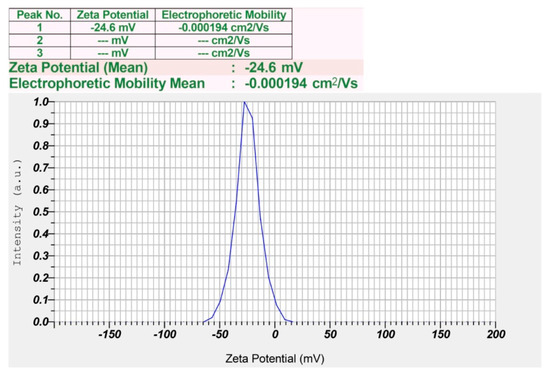The crystalline nature and composition of AgNPs and the phase purity of synthesized P-AgNPs were analyzed by XRD. The XRD graph (Figure 8) shows specific Bragg’s reflections with 2θ values at 111, 200, 220, and 311, which correspond to 38.08°, 44.18°, 64.41°, and 77.35°, respectively, in the JCPDS database of silver. These lattice plane values confirm the face-centered cubic crystalline nature of the synthesized P-AgNPs. The average particle size was 26.43 nm as calculated by Scherr’s equation. The surface charge potential and stability of the nanoparticle in the aqueous suspension was analyzed by the zeta potential. The zeta potential of synthesized P-AgNPs showed a sharp peak at −24.6 mV (Figure 9) and confirmed good stability.