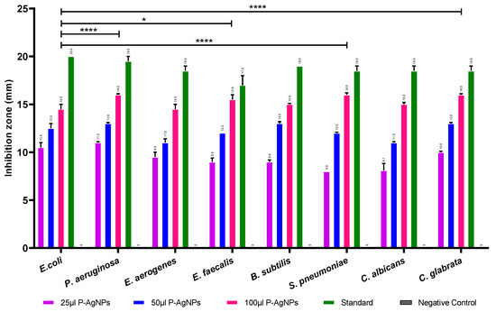 Figure 10. Antimicrobial activity of synthesized P-AgNPs against pathogenic microorganisms. Two-way ANOVA with multiple comparisons was performed to identify differences between groups. p < 0.05 (*), p < 0.001 (****).