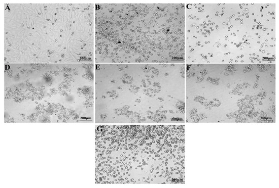 Figure 11. MTT assay of P-AgNPs from P. alba leaf extract against U118 MG cancer cell line. (A) Untreated cells, (B) Positive control, (C) 6.25 µg/mL, (D) 12.5 µg/mL, (E) 25 µg/mL, (F) 50 µg/mL, (G) 100 µg/mL.