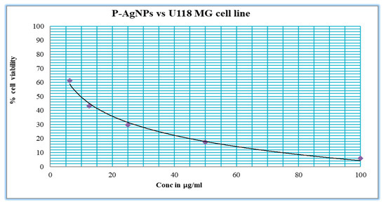 The anticancer activity of the synthesized P-AgNPs was evaluated by MTT assay against U118 MG cancer cell lines. The U118 MG human brain cancer cell lines were procured from NCCS Pune, India. DMEM (Dulbecco’s Modified Eagle Medium) high-glucose medium (#AL111, HiMedia, Mumbai, India) was used to culture the cell lines supplemented with 10% fetal bovine serum (FBS, #RM10432, Himedia, Mumbai, India), penicillin (100 IU/mL), streptomycin (100 μg/mL), and amphotericin-B (5 μg/mL) in a humidified incubator of 5% CO2 at 37 °C till confluence occurred. In the exponential growth period, these cell lines were washed, dissociated with trypsin (0.2%), and resuspended in complete culture media. A total of 200 µL of cell suspension was seeded in 96-well plates at the required cell density of 20,000 cells per well, followed by incubation at 37 °C and 5% CO2 for 24 h. Then, the P-AgNPs suspension with different concentrations of 6.25 µg/mL, 12.5 µg/mL, 25 µg/mL, 50 µg/mL, and 100 µg/mL was added to the culture medium, and cisplatin with a concentration of 6 µg/mL was taken as positive control depending upon its anticancer properties in GBM [26,30]. The plate was incubated for 24 h at 37 °C with an atmosphere of about 5% CO2, followed by the addition of 50 μL of MTT reagent to make up the final volume of 0.5 mg/mL. The plates were covered with aluminum foil to avoid exposure to the light and incubated for 4 h. A total of 100 μL dimethyl sulfoxide (DMSO) (#PHR1309, Sigma Aldrich, Bangalore, India) solubilization solution was added to each well to dissolve the formazan format on the last step. The absorbance was recorded at 570 nm by the ELISA reader, and the IC50 value was calculated by using a linear regression equation, i.e., Y = Mx + C, where Y = 50, M, and C values were derived from the viability graph [31,32]. Three independent experiments were performed.