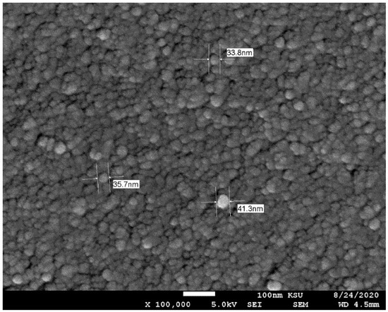Dispersed γ-Al2O3 (20% by weight) in water was obtained from Nanostructure and Amorphous Material Inc. in Los Alamos, NM, USA. Table 1 lists the specifications provided by the manufacturer. The required volume concentration of dispersed nanofluid was achieved by diluting it with distilled water. Four different volume concentrations of Al2O3–water nanofluid were prepared: 0.0%, 0.2%, 0.4%, and 0.8%. Another three additional volume concentrations (i.e., 0.1%, 0.5%, and 1%) were prepared for the purpose of evaluating the thermophysical properties of the nanofluid in order to provide a clear trend of the measured values. A magnetic stirrer (230 V, 50–60 HZ, 17 × 17 cm panel, 500 watt) was used for two hours in newly diluted nanofluid to prevent nanoparticle agglomeration. Additionally, the aggregation of the nanoparticles was disrupted using an ultrasonic agitation probe with high power output (Qsonica Q-700; 40 kHz, 700 watts, 3 s on and 1 s off, Newtown, CT, USA) for eight hours [32]. The stability of nanofluids is frequently investigated using a scanning electron microscope (SEM) [33,34]. As seen in Figure 1, using a JEOL JSM-6360 A SEM [Tokyo, Japan], the Al2O3 nanoparticles can be seen to be spherical in shape and exhibit a slight aggregation, where the size of the particles was approximately 10 nm.